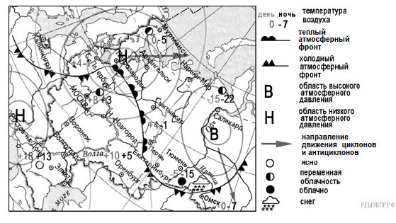 На одном из сайтов в Интернете были размещены карта погоды на 12 апреля 2013 г. и выдержки из прогноза погоды на этот день. Какие выводы о погоде на Европейской части России и в Западной Сибири подтверждаются сведениями карты? Запишите номера предложений, в которых указаны верные сведения.