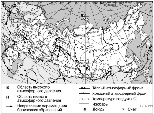 Михаил из Читы прослушал прогноз погоды по радио: «Завтра, 17 апреля, ожидается похолодание. Температура воздуха днём будет составлять 5 градусов по Цельсию. Ожидается пасмурная погода с дождём. Ветер западный, умеренный», но не услышал, для его ли города этот прогноз был составлен. С помощью карты определите, для какого из показанных на карте городов был составлен этот прогноз.