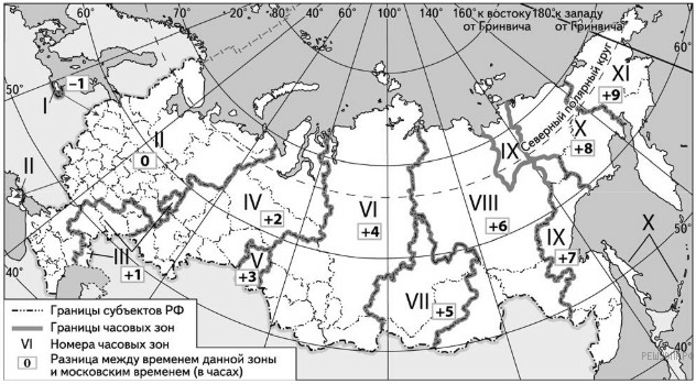 Образовательная акция «Всероссийский географический диктант» начиналась 14 ноября 2021 г. в 12 часов по местному времени, её продолжительность 45 минут. Георгий начинает его писать в Екатеринбурге. Используя карту, определите, в каких из перечисленных регионов диктант уже закончился. Запишите цифры, под которыми они указаны.